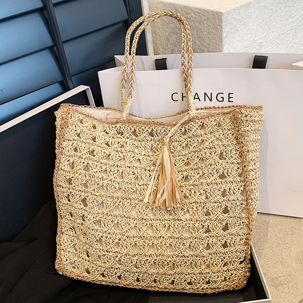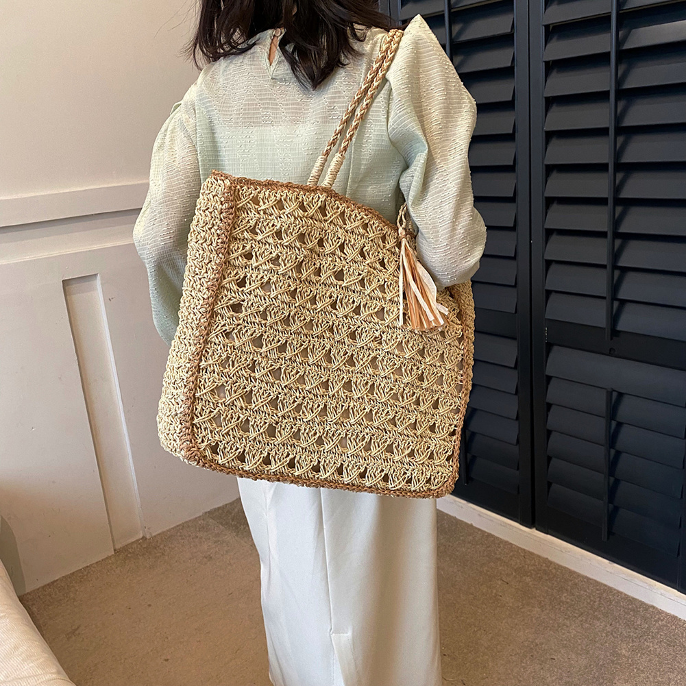 Women Casual Shoulder Bag Hollow Out Crochet Handbag with Short Handle with Tassel Solid Color Woven Bag for Female Girls